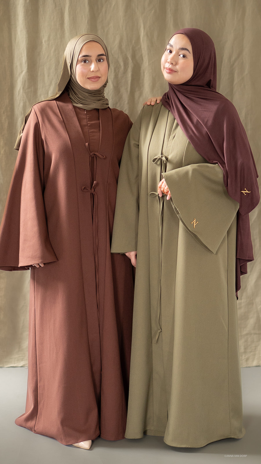 De Abaya en onderjurk vallen iets ruimer uit, bij twijfel een maat kleiner nemen. De lengte van de strikken kun je naar de gewenste lengte knippen. De onderjurk is voorzien van een rits aan de voorzijde.